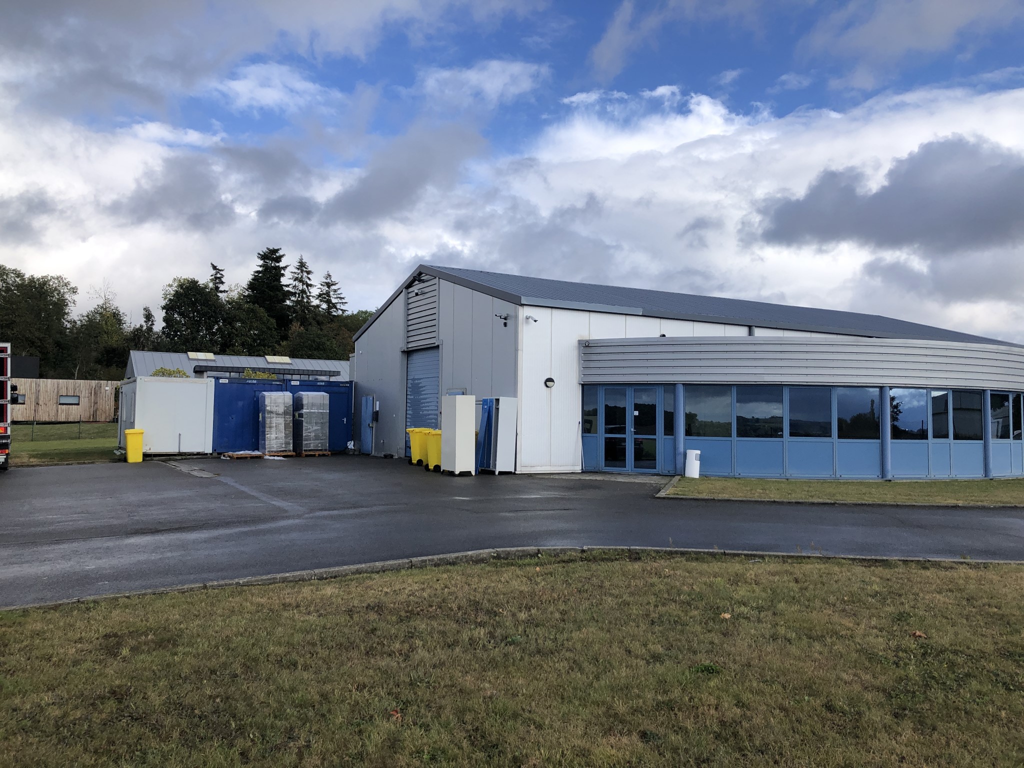 À l’avant de la zone de production, se trouve un bâtiment qui reprend les bureaux, les locaux sociaux, la conciergerie et un magasin. Cette construction sur 2 niveaux est de type traditionnel en blocs de béton lourds et bardage esthétique. L’idée est de différencier la zone de production de la partie administrative, résidentielle et sociale.