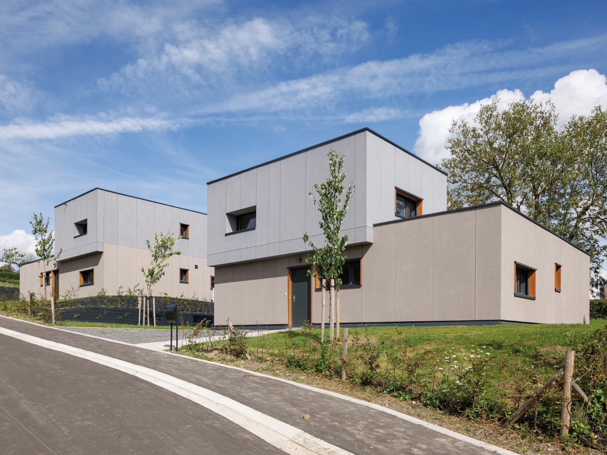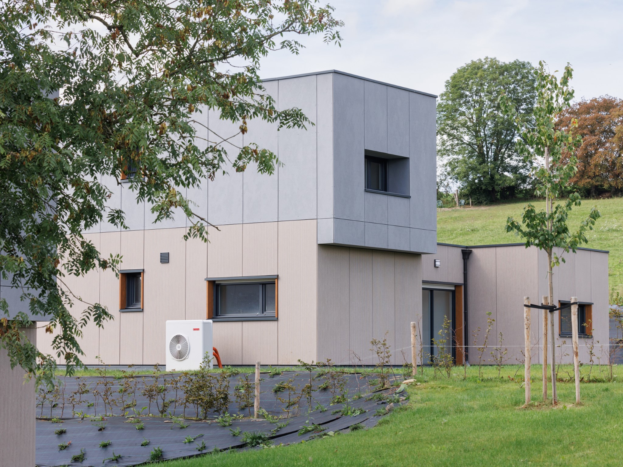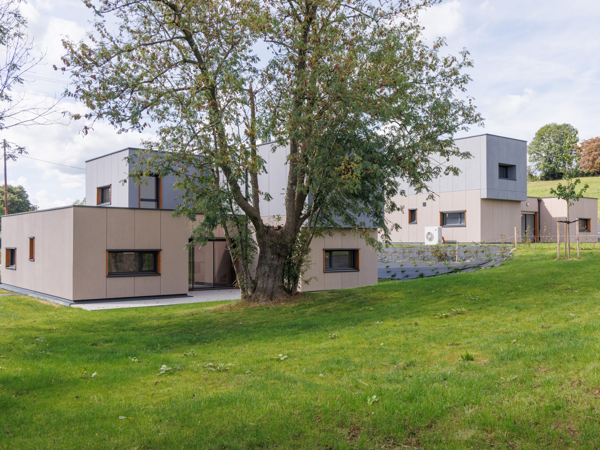 Les 2 constructions modulaires présentent une architecture non traditionnelle. Structure en bois, bardage en fibre ciment et toiture plate. Les bâtiments sont installés sur le terrain en pente en prenant la moyenne des niveaux du terrain naturel afin d’éviter les grands déblais et remblais.